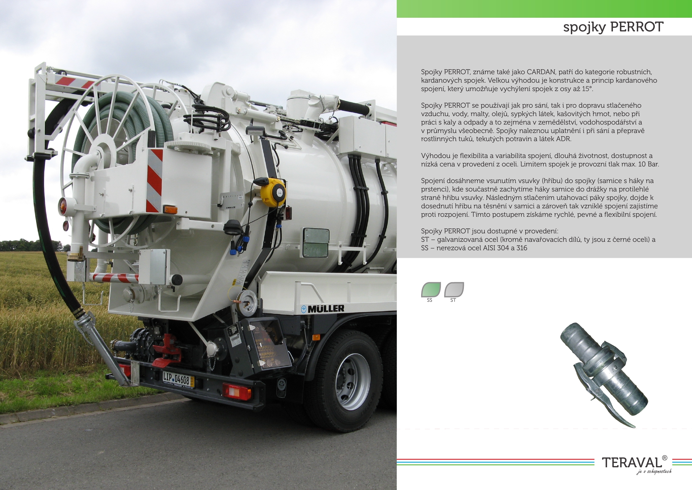 - Spojky PERROT se používají jak pro sání, tak i pro dopravu stlačeného vzduchu, vody, malty, olejů, sypkých látek, kašovitých hmot, nebo při práci s kaly a odpady a to zejména v zemědělství, vodohospodářství a v průmyslu všeobecně. Spojky naleznou uplatnění i při sání a přepravě rostlinných tuků, tekutých potravin a látek ADR. Jsou velmi oblíbené u přepravců, kteří likvidují odpady a kaly pomocí technologie sacích bagrů.