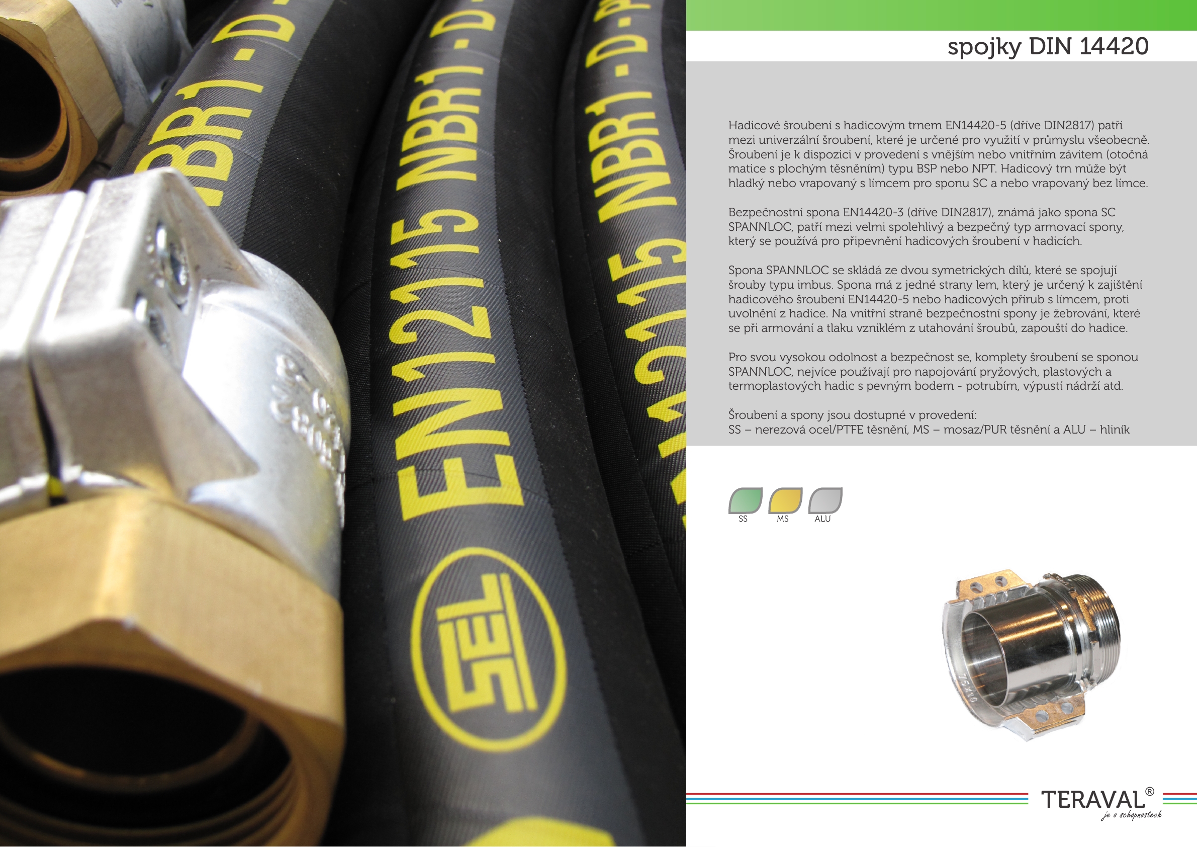 - Pro svou vysokou odolnost a bezpečnost se komplety (šroubení a bezpečnostní spony EN14420) nejvíce používají pro napojování pryžových, plastových a termoplastových hadic s pevným bodem (potrubím, výpustí nádrží a podobných zařízení). Spojky a spony jsou určené pro všechny typy látkových skupenství. Limitem tohoto typu šroubení a spon je maximální provozní tlak 16 Bar a teplotní odolnost -30 až +300°C.